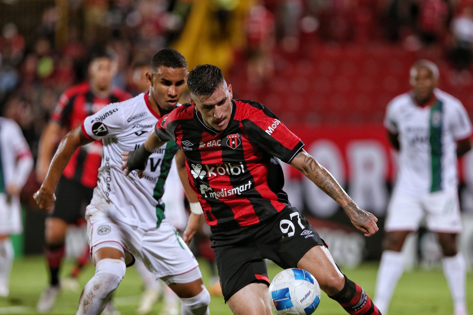 Anderson Canhoto anotador de un gol del Alajuelense en acción contra el Marathon el 1 de agosto, 2024 en la Copa Centroamericana de Concacaf.
