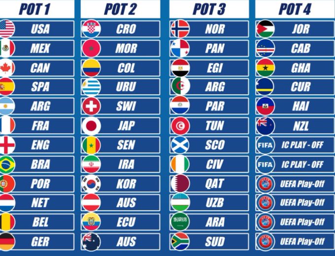 Bombo 4: Jordania, Cabo Verde, Ghana, Curasao, Haití, Nueva Zelanda, clasificados A, B, C y D de las eliminatorias europeas, clasificados 1 y 2 del torneo clasificatorio de la FIFA.