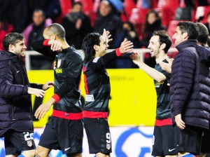 Atletico Madrid’s Colombian forward Radamel Falcao (C) celebrates with his teammates at the end of the Copa del Rey (King’s Cup) semi-final second leg football match Sevilla FC vs Atletico de Madrid at the Ramon Sanchez Pizjuan staduim in Sevilla on February 27, 2013. The match ended in a 2-2 draw. AFP PHOTO / CRISTINA QUICLER