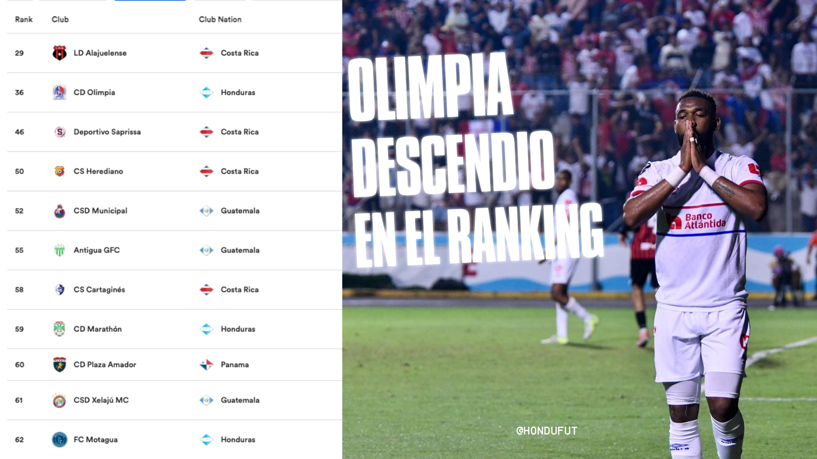 Motagua eliminado en el repechaje ocupa la posición número 12 en Centroamérica, Real España que se quedó fuera de la final es el número 65 en general y 15 en Centroamérica y el equipo que más sufrió por la eliminación ante Alajuelense fue el Olimpia que pasó al segundo lugar al descender tres escaños.