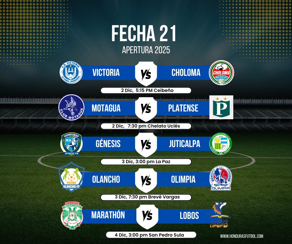 La jornada comenzará el martes 2 de diciembre en La Ceiba cuando el Victoria y Choloma protagonicen una final adelantada en la férrea pelea por dejar el último lugar. Previo al encuentro, Victoria y Choloma están empatados con 11 puntos.