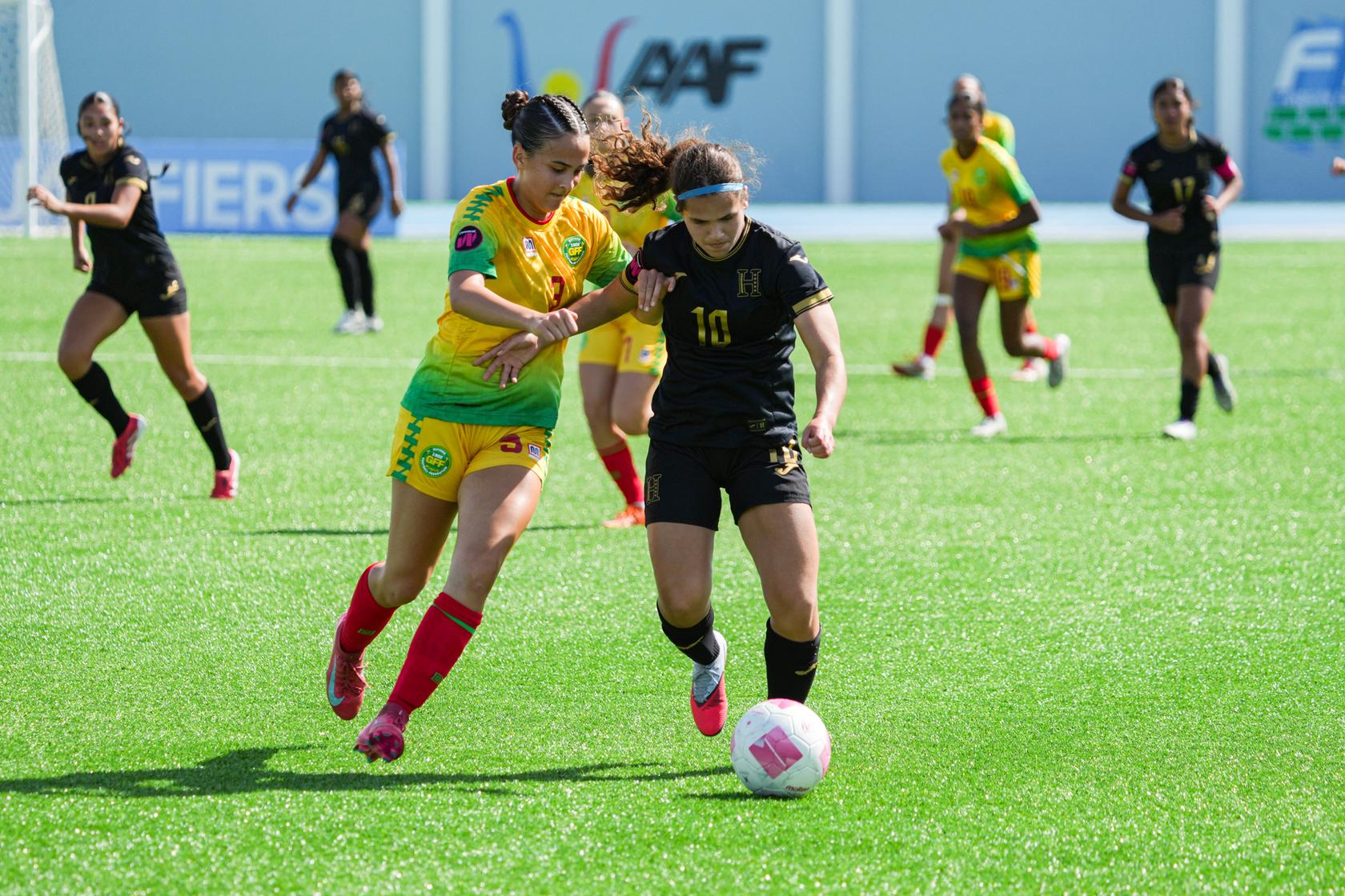 Alejandra Merriam de Honduras controla el balón contra Zonia Harry de Guyana el 31 de enero, 2026 en las eliminatorias femeninas Sub-17 de la Concacaf. (Foto Concacaf Media)