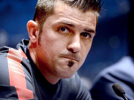 (FILES) — A file picture taken on April 1, 2013 shows Barcelona’s Spanish striker David Villa during a press conference at the Parc-des-Princes stadium in Paris. Spanish football club Atletico Madrid has reached a deal on July 8, 2013 in principle to sign Villa for 5.1 million euros. AFP PHOTO / FRANCK FIFE