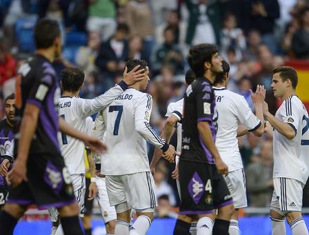 Real Madrid’s Portuguese forward Cristiano Ronaldo (C) celebrates with teammates after scoring during the Spanish league football match Real Madrid CF vs Valladolid at the Santiago Bernabeu stadium in Madrid on May 4 , 2013. AFP PHOTO / DANI POZO