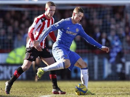 Chelsea’s Fernando Torres, right, controls the ball in front of Brentford’s Adam Forshaw, left, during their English FA Cup fourth round soccer match in London, Sunday, Jan. 27, 2013. The match ended in a 2-2 draw. (AP Photo/Lefteris Pitarakis)